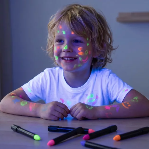 Bought this glow set for New Year’s Eve. We drew fireworks on our faces, laughed at the mirror under UV, and it all rinsed off before bedtime without scrubbing.