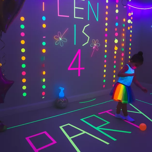 At my cousin’s sleepover, we used the neon tape to make cool shapes on the walls. We peeled it off in the morning and nothing was left behind.