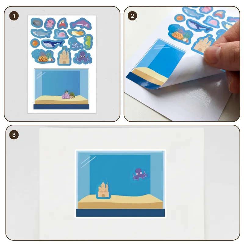 Transform any rainy afternoon into a creative journey. Brightly coloured stickers bring the magic of the ocean to life. Each activity keeps little hands busy and minds inspired. Enjoy bonding and laughter as your child builds their dream aquarium.