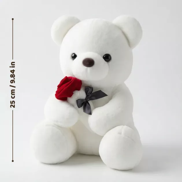 This little bear is the coziest thing ever. The rose is pretty and my puppy even tries to snuggle with it.