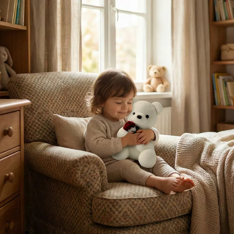 My daughter hugs her teddy every night and smiles so big. It’s super soft and the rose looks so sweet in her arms!