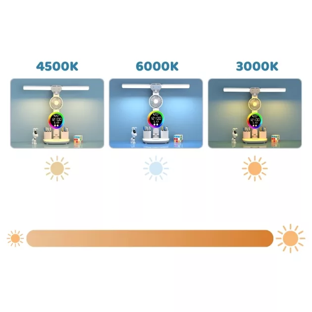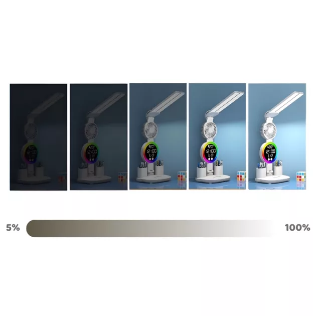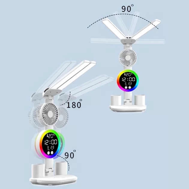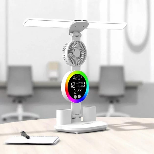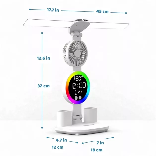 I set alarms with the clock so I finish my work faster. The lamp is nice and the fan is gentle but keeps me cool.