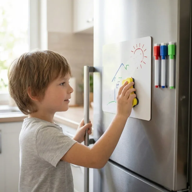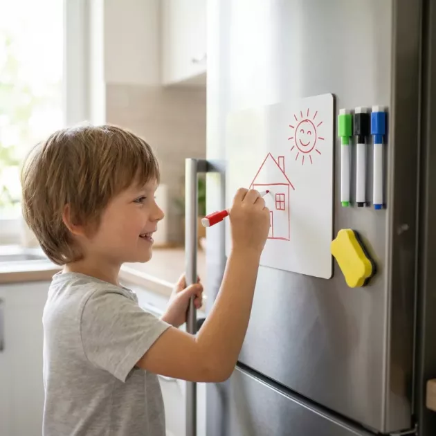 The whiteboard lives on our freezer door. We write shopping lists, soccer times, and funny doodles. It keeps everyone on track while still feeling playful and relaxed.